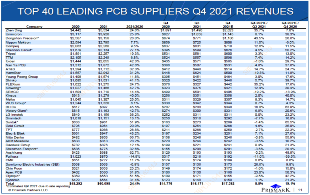 尊龙集团科技位列2021年Q4全球40强PCB企业第22名